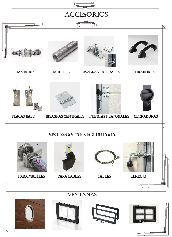 Ponemos a disposición de nuestros clientes una amplia gama de accesorios para puertas seccionales. Tanto para repuestos como para otras ocasiones.